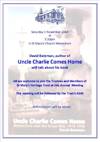 Members Event & AGM Event Details Start: 1 November 2014 3:30 pm End: 1 November 2014 5:00 pm Venue: St Mary's Church David Bateman, author of “Uncle Charlie Comes Home” will be the speaker.